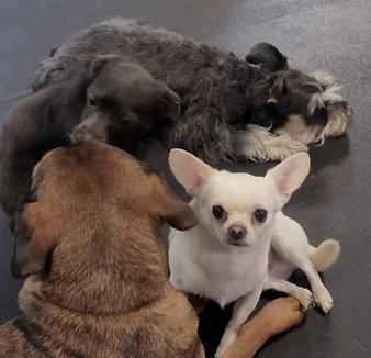 We specialize in pampering and spoiling your fur baby, so you can rest assured they're having just about as much fun as you are while you're away. While we do not have anyone who stays during the evening, we do have cameras that we watch throughout the nighttime. Your dog must get along with others, while boarding they will be attending daycare during the day with all other dogs. They’ll be fed breakfast and dinner, lunch if you prefer. For your dogs stay, you have the option to board them in a kennels which come in different sizes and our suite thats roughly around 11 square feet.